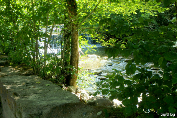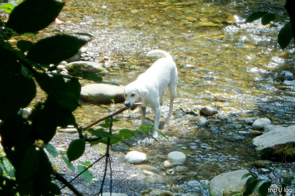聞こえてくる沢の音、太陽光を浴びる新緑、爽やかな風、プリティわんこ、なんだここは天国か