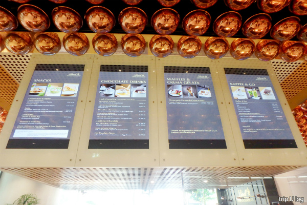 自家製ジェラート(CHF5.50 / ハーフCHF3.00)・自家製ジェラート添えワッフル(CHF10.50~ / ハーフCHF6.50~)・チョコレートカップケーキ(CHF5.00)・チョコレートブラウニー(CHF5.50)・チョコレートクッキー(CHF4.50)・etc…