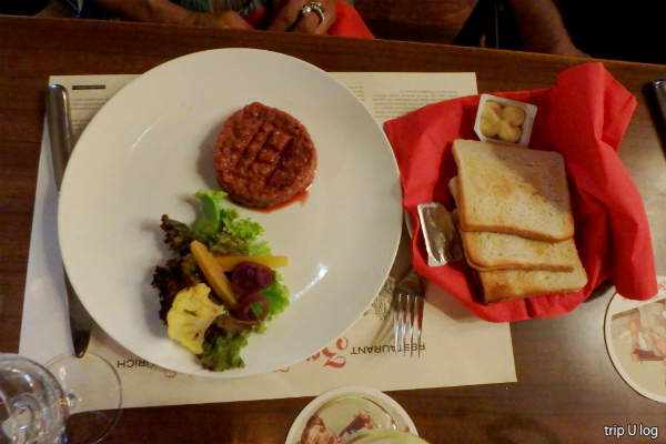 マイルド又はスパイシーなビフテキ、トースト・バター・サラダ付き「Beef Tatar」(CHF32.00)