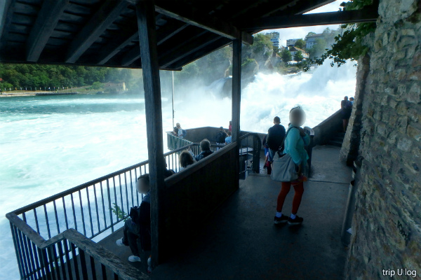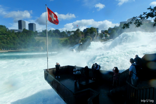 滝の真ん中辺りに位置する、スイス国旗が立てられた岩場に