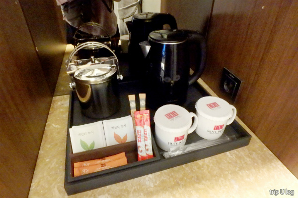 飲み物は、ミネラルウォーター500ml 2本・McNulty の緑茶ティーバッグ2個・紅茶ティーバッグ2個・The Coffee Bean & Tea Leaf のインスタントコーヒー2個・Dong Suh(동서)のプリマコーヒークリーム2個・砂糖2個。